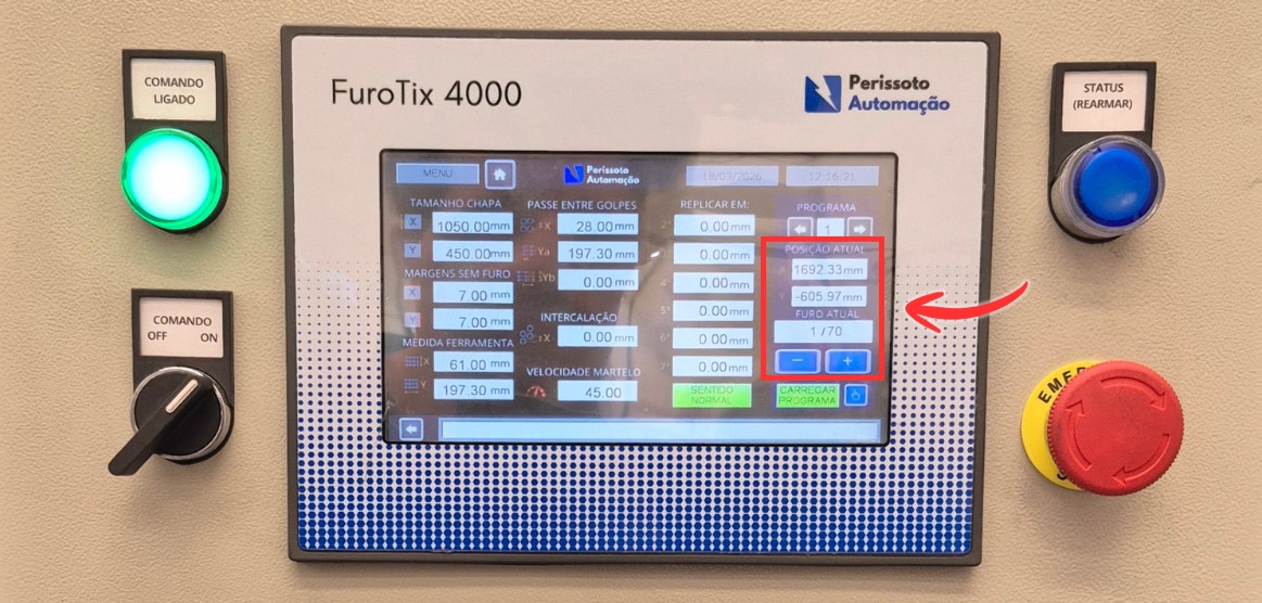 Ao iniciar o programa, o martelo entra em rotação, a embreagem aciona o movimento e os golpes começam a ser executados. A cada ciclo, os eixos se reposicionam automaticamente para o próximo furo. Nosso algoritmo garante que, em deslocamentos maiores, a embreagem seja desacoplada no momento exato, mantendo o martelo no topo e permitindo o movimento seguro da chapa.
